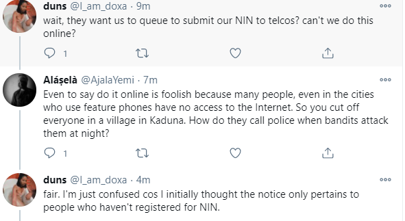 Nigerians are currently reacting to the Federal government's directive for telecommunications companies to block sim cards that are not registered with the National Identity Numbers, NIN. On Monday, December 14, the Nigerian Communications Commission held an emergency meeting chaired by the Minister of Communications, Isa Pantami, where the order was given. A statement released by the NCC reads in part ''Following the earlier directive on the suspension of new SIM registration by network operators, the Honourable Minister of Communications and Digital Economy, Dr. Isa Ali Ibrahim (Pantami) convened an urgent meeting of key stakeholders in the Communications industry on Monday, December 14, 2020.The meeting had in attendance the Chief Executive Officers (CEOs) and Management of the Nigerian Communications Commission (NCC), the National Information Technology Development Agency (NITDA), the National Identity Management Commission (NIMC), as well as the CEOs and Management staff of all service providers in the industry.Stakeholders agreed that urgent drastic measures have now become inevitable to improve the integrity and transparency of the SIM registration process.Following decisions were taken for immediate implementation by all Network Operators: Affirmation of the earlier directive to totally suspend registration of NEW SIMs by all operators.Operators to require ALL their subscribers to provide valid National Identification Number (NIN) to update SIM registration records.The submission of NIN by subscribers to take place within two weeks (from today December 16, 2020 and end by 30 December, 2020).After the deadline, ALL SIMs without NINs are to be blocked from the networks. A Ministerial Task Force comprising the Minister and all the CEOs (among others) as members is to monitor compliance by all networks.Violations of this directive will be met by stiff sanctions, including the possibility of withdrawal of operating license. The general public is hereby urged to ensure that their NINs are captured in their SIM registration data,” Nigerians are reacting to this development, pointing out that it wasn't well thought out. They argue that such a directive should not have been given at a time when the country is still battling with the COVID19 pandemic. They also pointed out that the process of getting the NIN has been frustrating over the years. Aisha Yesufu while reacting to the news tweeted''The refused to give Nigerians COVID-19 palliatives. They imposed all sorts of taxes and charges. Now they are charging you to retrieve NIN. In the meantime, they haven't reduced cost of governance or their jumbo political salaries. Everything to squeeze the little people have!'' Kate Henshaw while expressing her displeasure to the directive, wrote''Driver's licence - whosai International passport - baabu BVN - for where National ID card - nayheee Its now NIN one needs to get a sim. These people are not going to be satisfied till they bleed us dry and make this hell fiery fiery hot for us. Issokay'' See the reactions below from Linda Ikeji's Blog https://ift.tt/3amiLtv